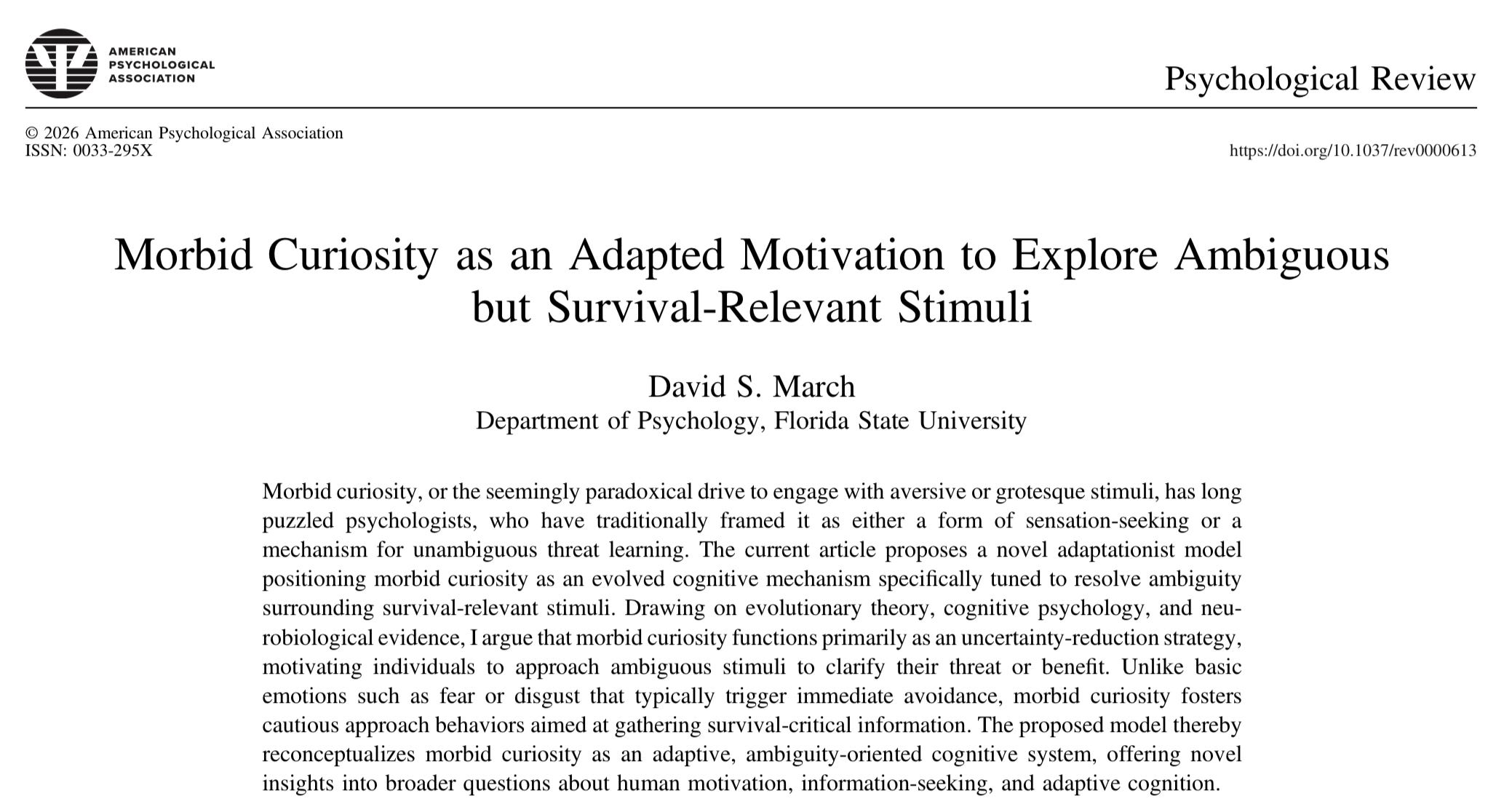 Morbid Curiosity as an Adapted Motivation to Explore Ambiguous but Survival-Relevant Stimuli by David March was published in Psychological Review this week.