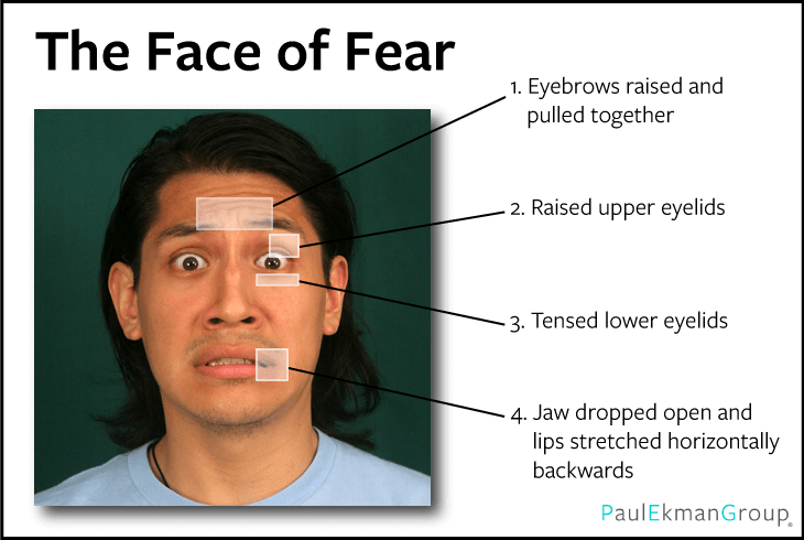 The prototypical “fear face” may be a precursor to a scream. Your mouth is widened, ready to let out a screeching alarm call to those not within your line of sight. And, as with the scream, it may signal vulnerability rather than fear per se.